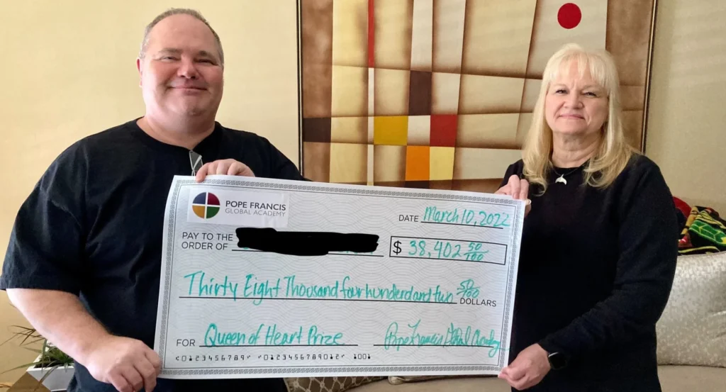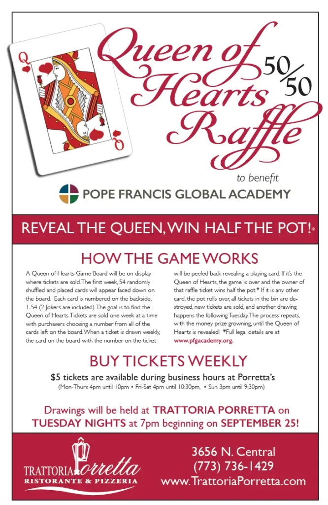 Your purchase of a Queen of Hearts Raffle ticket is subject to the Office Rules effective as of the date of purchase and hereby incorporated in full by this reference and which are posted at Pope Francis Global Academy and at Trattoria Porretta.